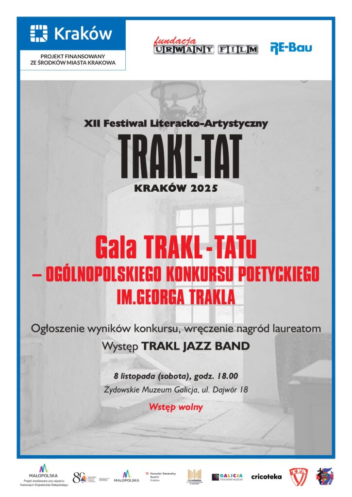 Oficjalne wyłonienie zwycięzców i wręczenie nagród odbędzie się podczas finałowej gali TRAKL-TATu, 8 listopada 2025 r., w Żydowskim Muzeum Galicja w Krakowie, ul. Dajwór 18.
